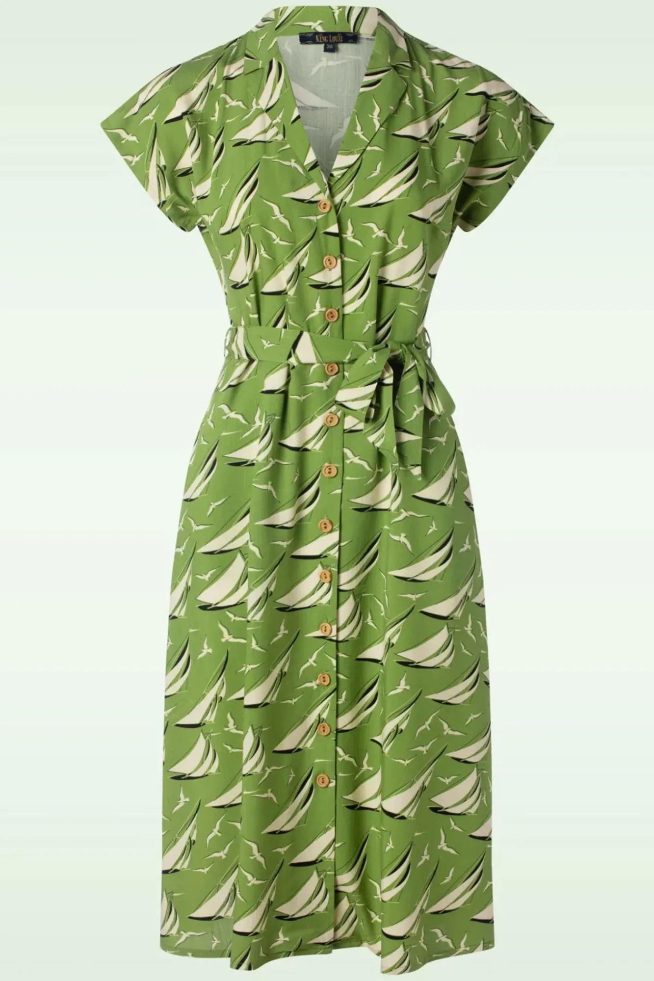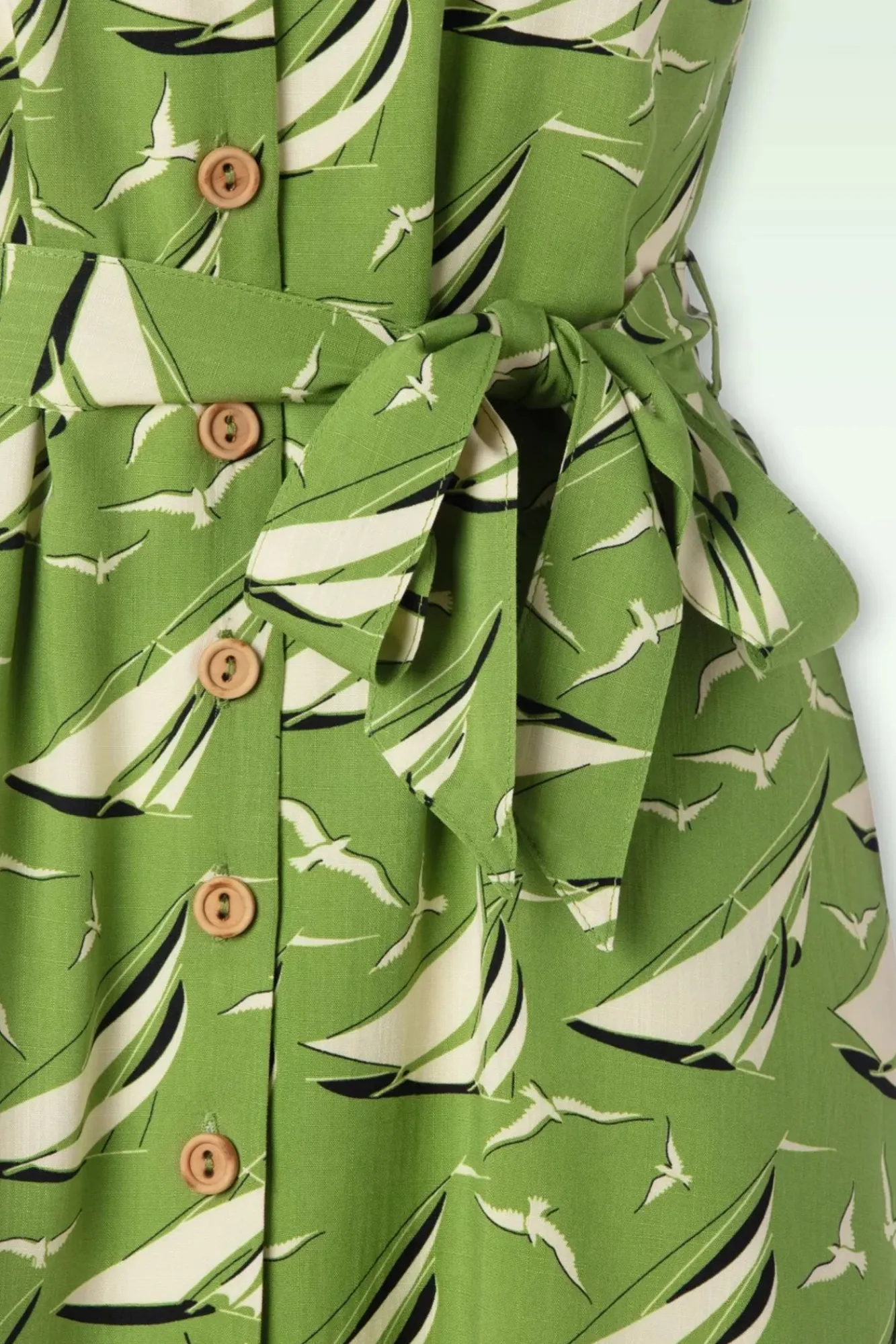 Ik Ga Op Stedentrip En Ik Neem Mee… Cute Shoes, Mijn Zonnebril, Paspoort En Deze Midi Jurk Natuurlijk! Uitgevoerd In Een Dunne, Luchtige, Licht Olijfgroene Viscose (Stretcht Niet)Voorzien Van Een Leuke Print Met Zeilbootjes En Vogels.