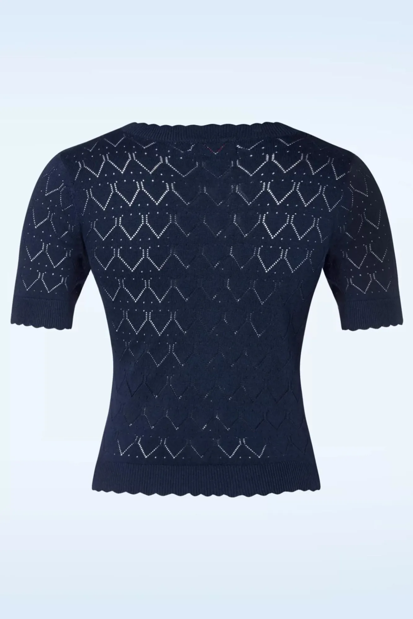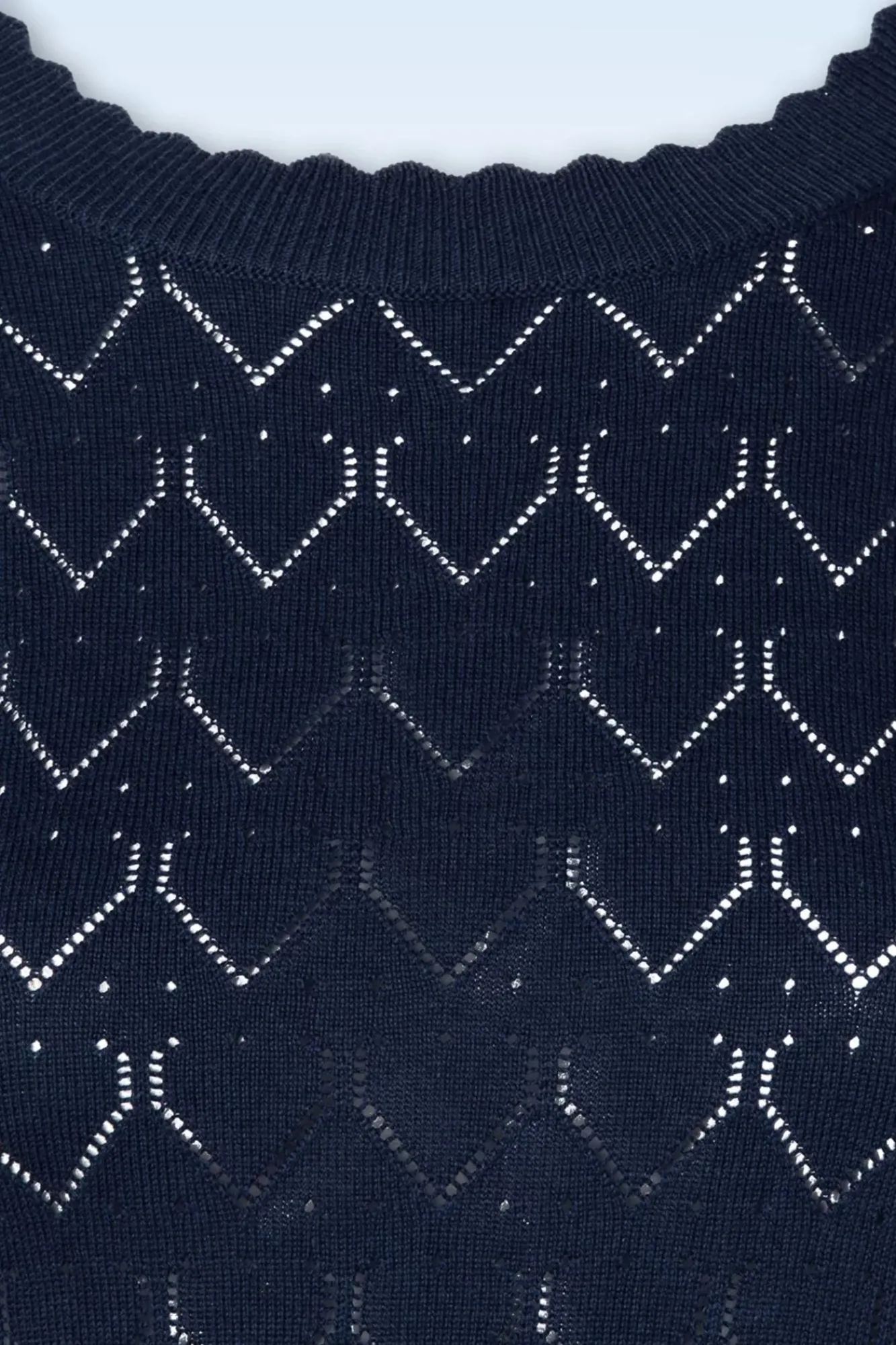De Sweet Gardina Jumper In Navy Maakt Met Iedere Outfit Een ‘Perfect Match’! Ze Heeft Een Ronde Halslijn, Korte Mouwtjes En Geschulpte Ribboordjes. Uitgevoerd In Een Zachte, Fijngebreide Mix Van Viscose En Katoen En Is Voorzien Van Een Opengewerkt Ajour Patroon. De Combinatiemogelijkheden Zijn Eindeloos!