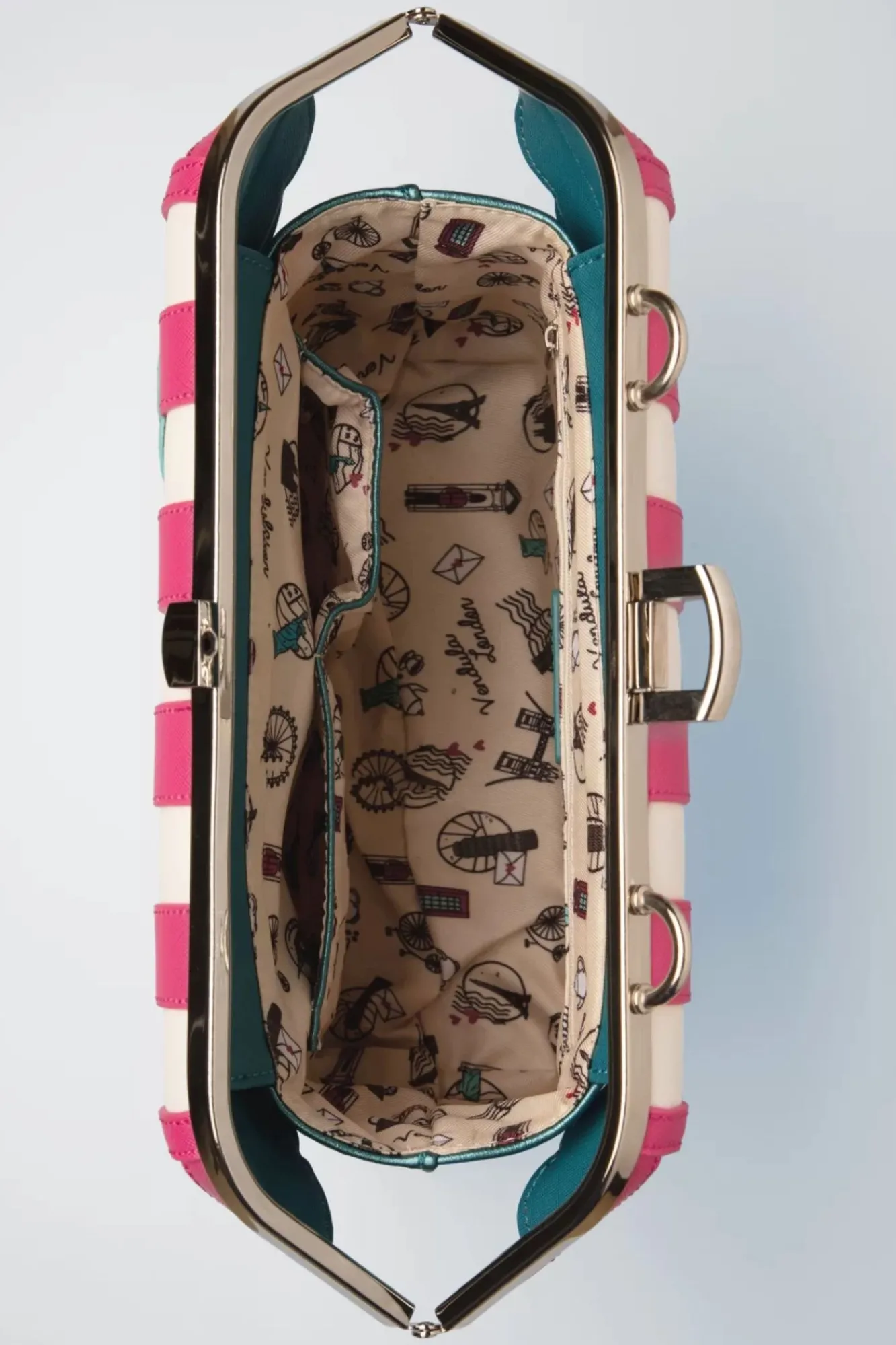 ”Let The Good Times Roll!” Het Is Bijna Onmogelijk Te Omschrijven Hoe Mooi Deze Handgemaakte Tas Is. Dit Middelgrote Model Is Uitgevoerd In Een Combinatie Van Metallic Tealblauw, Roze En Wit Vegan Leder En Laat Een American Diner Met Drive-Thru En Drive-In Movie Theatre Zien. Door Al Die Verschillende Kleuren, Materialen En Het Delicate Stikwerk Is Het Eigenlijk Een Gedetailleerd Kunstwerk Waarbij Je Steeds Iets Nieuws Ontdekt. ”I Would Like A Large Milkshake, Some Fries, A Burger And This Bag Please!”