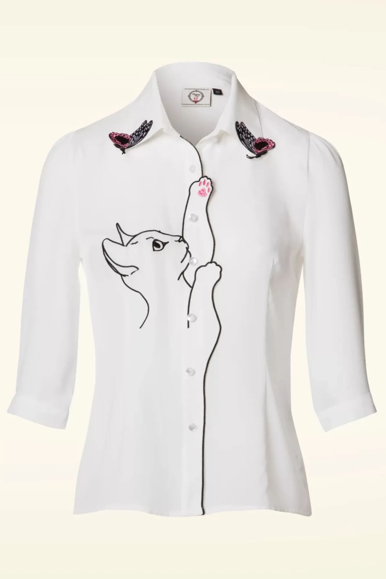 Cat Ladies Opgelet; Deze 60S Snow Bird Blouse In Ivory White Doet Je Hartje Sneller Kloppen! ‘Behind Every Great Person, There Is A Great Cat… Blouse!’ Snow Bird Is Speels, Schattig En Altijd Nieuwsgierig. Ze Heeft Er Maar Moeite Mee Om Haar Aandacht Op Een Punt Tegelijk Te Vestigen… ”Hey, Wat Is Dat? Vlinders?!” Deze Cutie Heeft Een Puntig Kraagje Met Vlinderapplicaties, 3/4 Pofmouwen En Een Reeks Glanzende Knopen. Uitgevoerd In Een Soepel, Semi-Doorschijnend, Ivoorwit, Crêpe-Achtig Stofje (Stretcht Niet!). ‘Oh Snow Bird, Stop Being So Cute!’