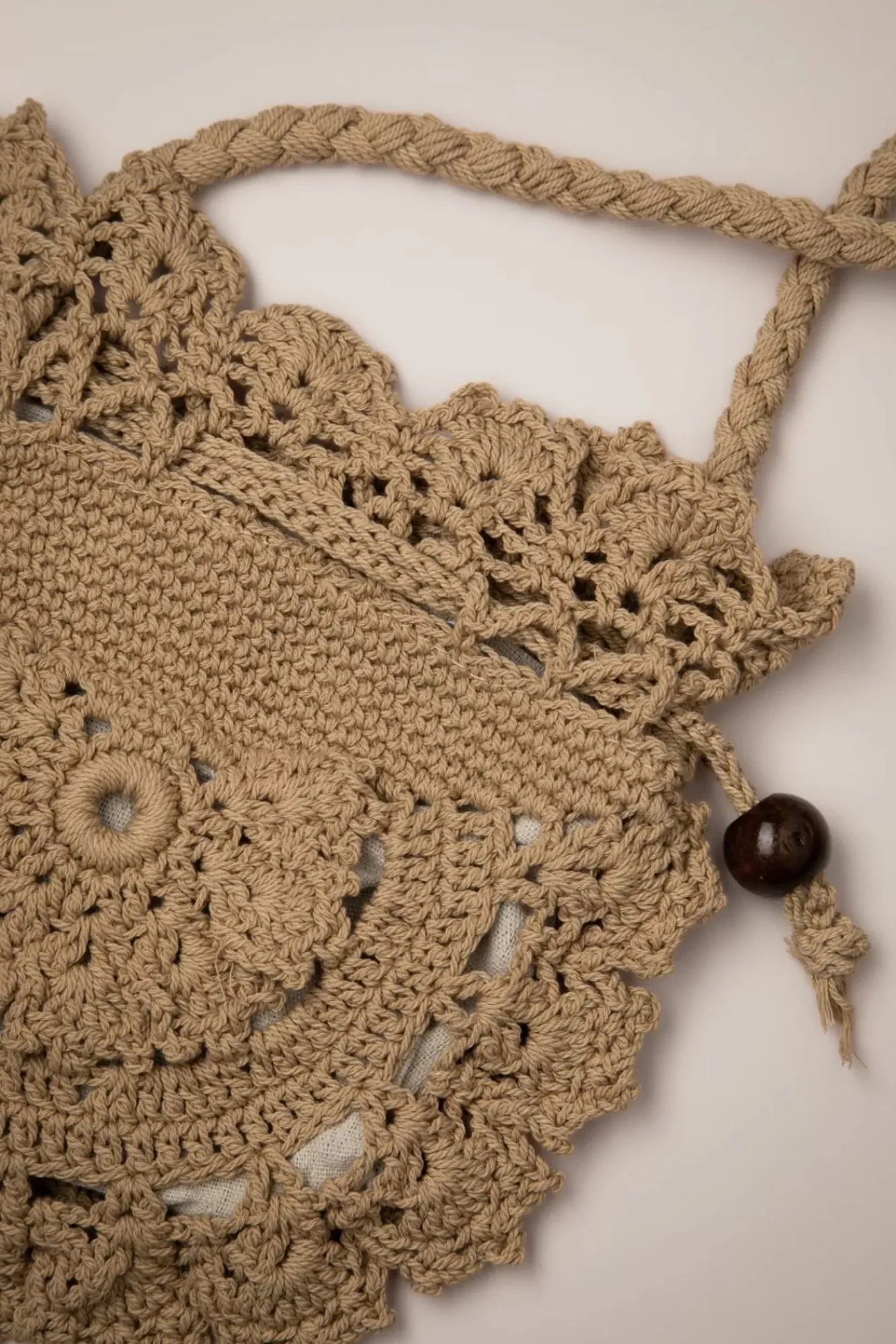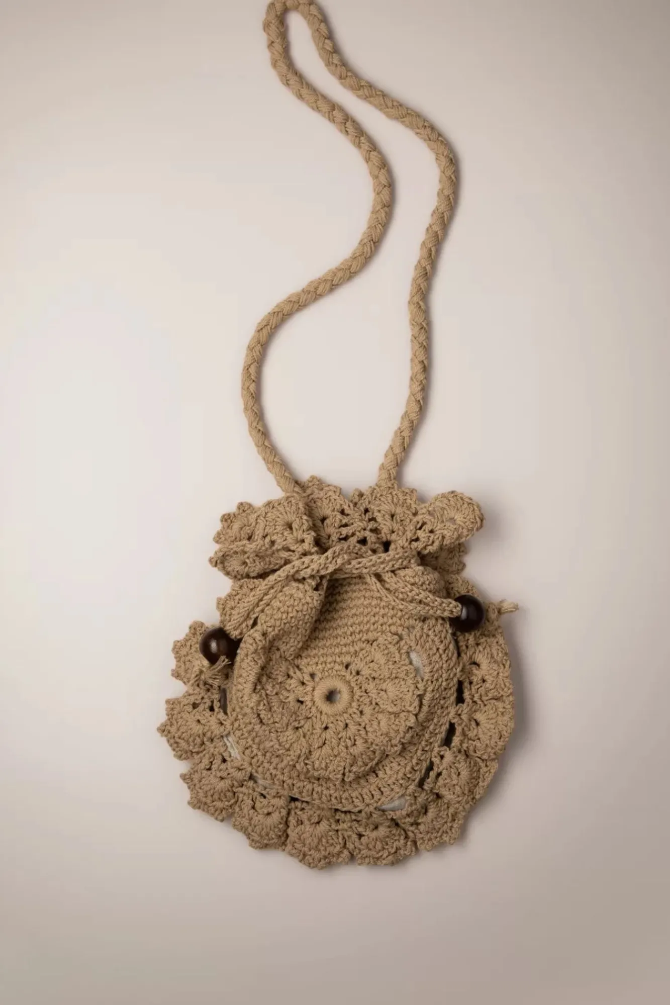 ”Crochet… All Day, Everyday!” 😉 Deze Zandkleurige Gehaakte Schoudertas In De Vorm Van Een Buideltje Geeft Iedere Outfit Een Boho Vibe En Is Afgewerkt Met Een Trekkoord Voorzien Van Houten Kralen.