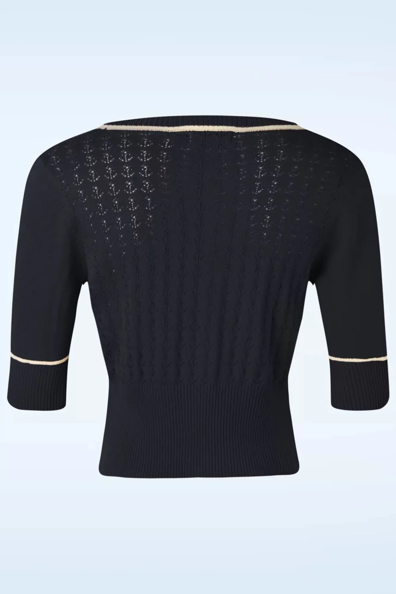 Gaat Jouw Hartje Ook Sneller Kloppen Van Deze 50S Boat Club Cardigan In Navy? 😉 Deze Cardigan Heeft Een V-Halslijn, 1/2 Mouwen En Houten Knopen Met Ankertjes. Uitgevoerd In Een Zachte, Fijngebreide, Navyblauwe Viscose-/Katoenmix Met Een Heerlijke Stretch, Een Opengewerkt Ankerpatroon En Crèmekleurige Biezen. ”Love At First Sight!”
