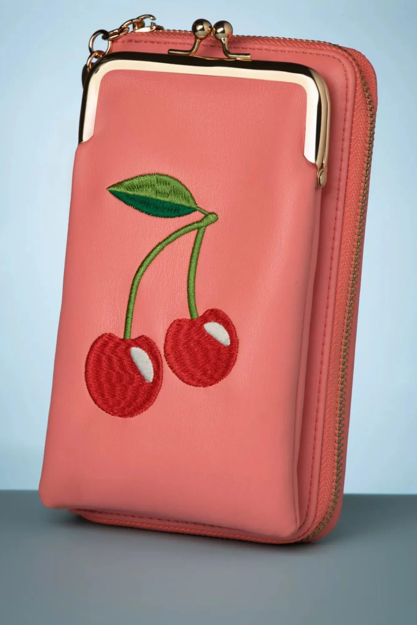 Wat Heb Je Eigenlijk Echt Nodig Tijdens Een Shopping Spree Of Een Lunch Met Vriendinnen? Je Telefoon, Je Favoriete Lipstick En Geld, Toch? Laat Je Grote Handtas Maar Thuis Want Dit Praktische Telefoontasje Is Alles Wat Je Nodig Hebt. Uitgevoerd In Koraalroze Imitatie Leder Met Een Geborduurde Kers Op De Voorzijde.