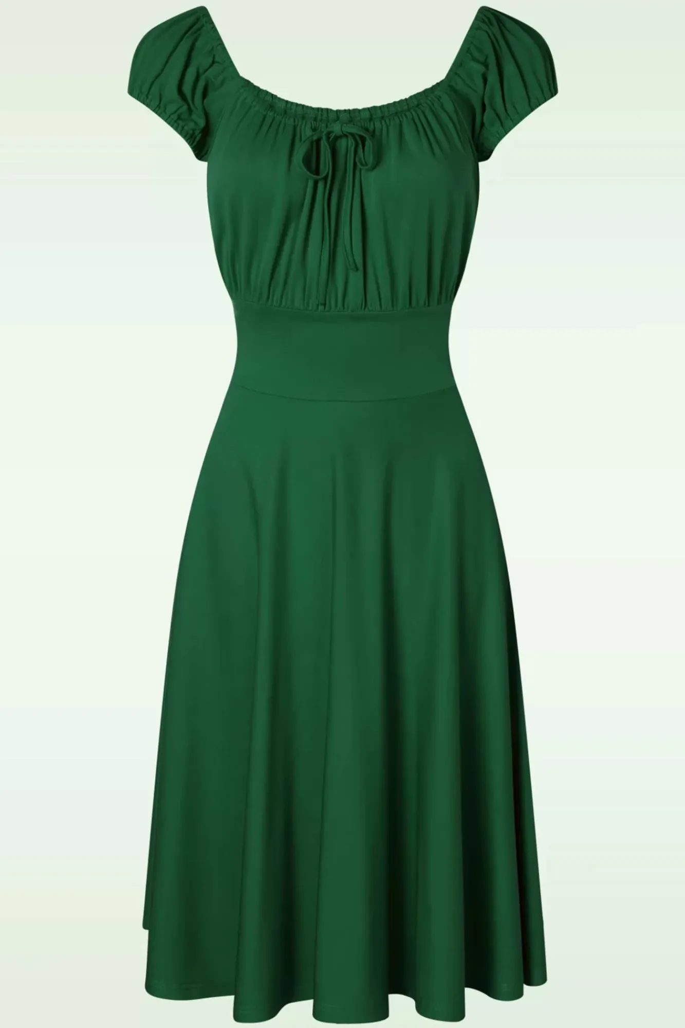 Swingend De Zomer In Met Deze Tessy Swing Dress In Forest Green! De Top In Carmen Stijl Heeft Een Ronde Halslijn Met Een Vast Strikje, Een Geplooide Buste En Korte Pofmouwtjes Die Off-Shoulder Gedragen Kunnen Worden. Vanaf De Taille Loopt Ze Uit In Een Zwierige, Semi-Swing Rok Met Handige Steekzakken. Uitgevoerd In Een Soepele En Stretchy, Donkergroene Stof Die Heerlijk Draagt. Zomer?! Wij Zijn Klaar Voor Je! 😉
