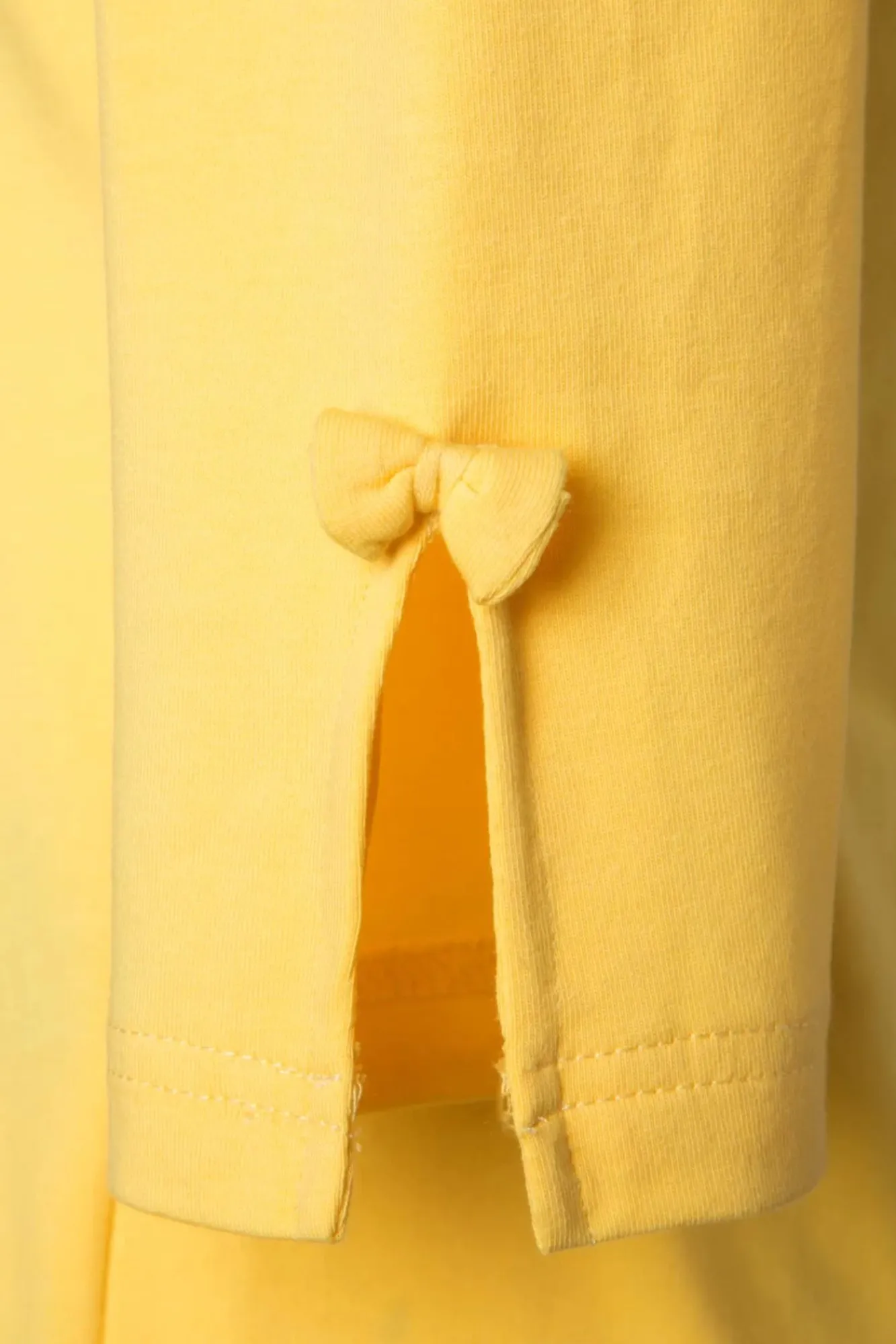 Deze 50S Oonagh Top In Yellow Is Eenvoudig Maar Toch Speciaal Door De Lieflijke Details! De Top Heeft Een Mooie ‘slash’ Halslijn En Mouwtjes Met Splitjes Die Afgezet Zijn Met Kleine Strikjes, Só Cute! Uitgevoerd In Heerlijk Soepel En Stretchy, Gele Katoen Die Zijn Perfecte Pasvorm Zal Blijven Behouden, Zelfs Na Een Aantal Wasbeurten. Een Veelzijdige Classy Top Die Niet Mag Ontbreken In De Kast Van Een Echte Vintage Lady 😉
