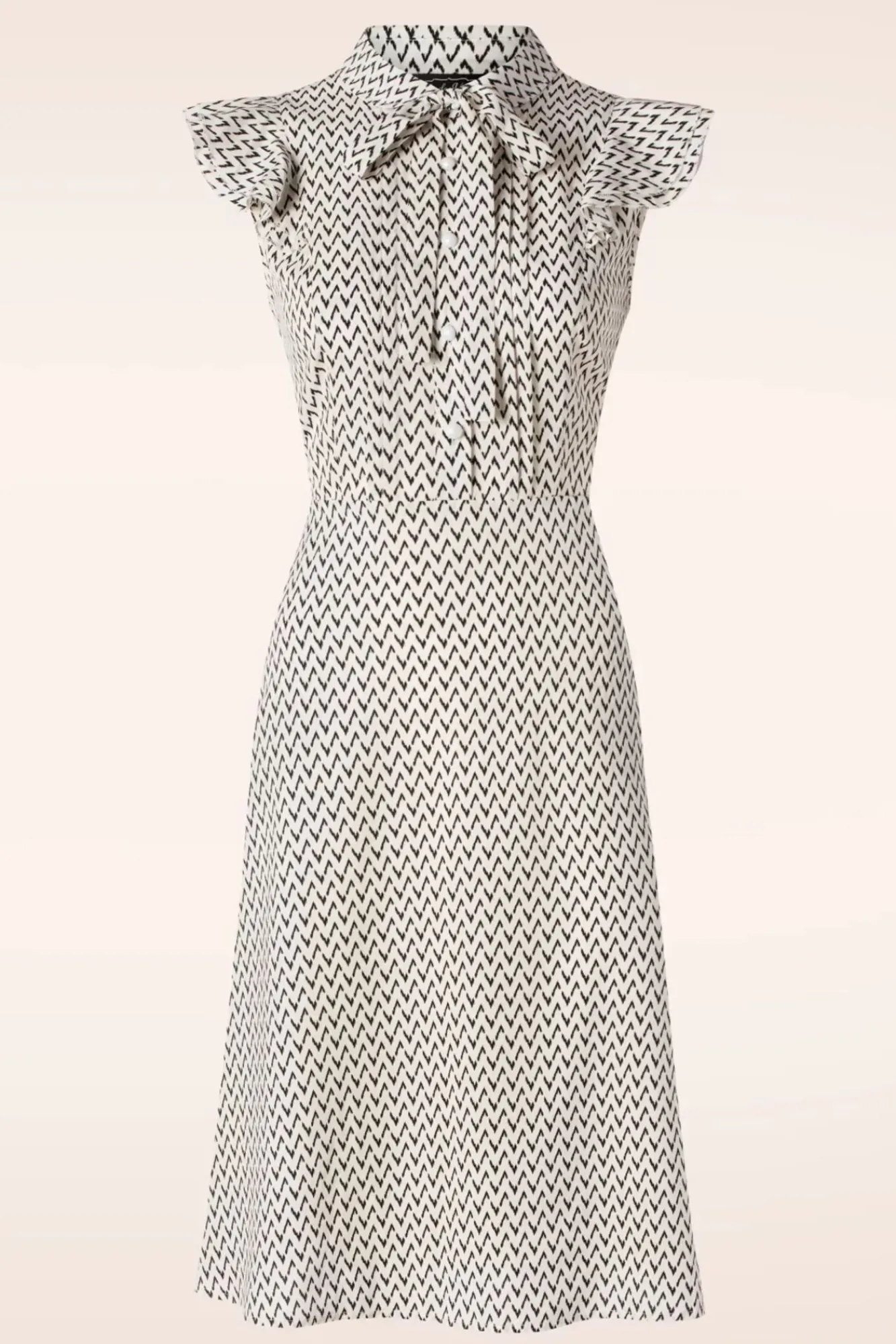 “Flourish And Flair!” Deze Tijdloze, Klassieke En Vrouwelijke Jurk Is Uitgevoerd In Een Soepele, Luchtige En Comfortabele Crèmekleurige Stof (Stretcht Amper), Met Een Grafisch Zigzag Patroon.