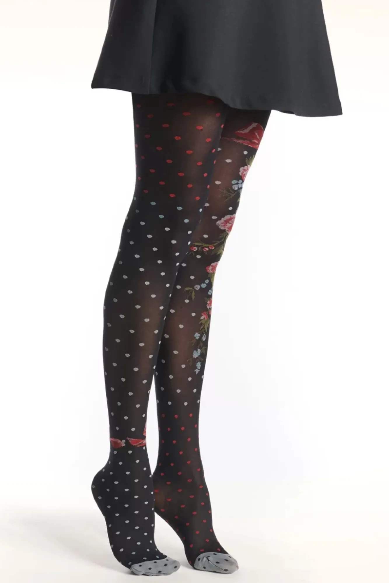 Laat Je Benen Spreken! Deze Zwarte, 30 Denier Panty Zit Heerlijk Comfortabel Om Je Benen, Stretcht Goed Mee En Heeft Een Prachtig Ingeweven Patroon Van Polkadots En Rozen.