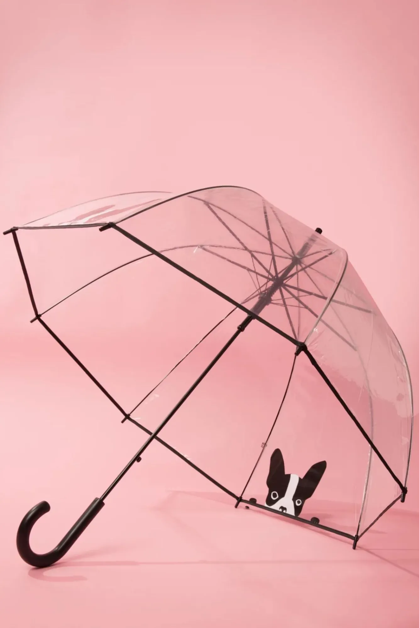 Handig En Stylish Deze 50S It’s Raining Dogs Transparent Dome Umbrella, Je Ziet Precies Waar Je Loopt In De Regen! De Paraplu Bevat Een Zwart Kunststof Handvat En Het Transparante Scherm Is Gemaakt Van Waterdicht Polyester Met Een Klein Zwart Randje En Een Super Leuke Print Van Een Hond. Begint Het Opeens Hard Te Regenen? Druk Snel Op De Knop En *Plop* Je Bent Gered. I’M Singin’ In The Rain!