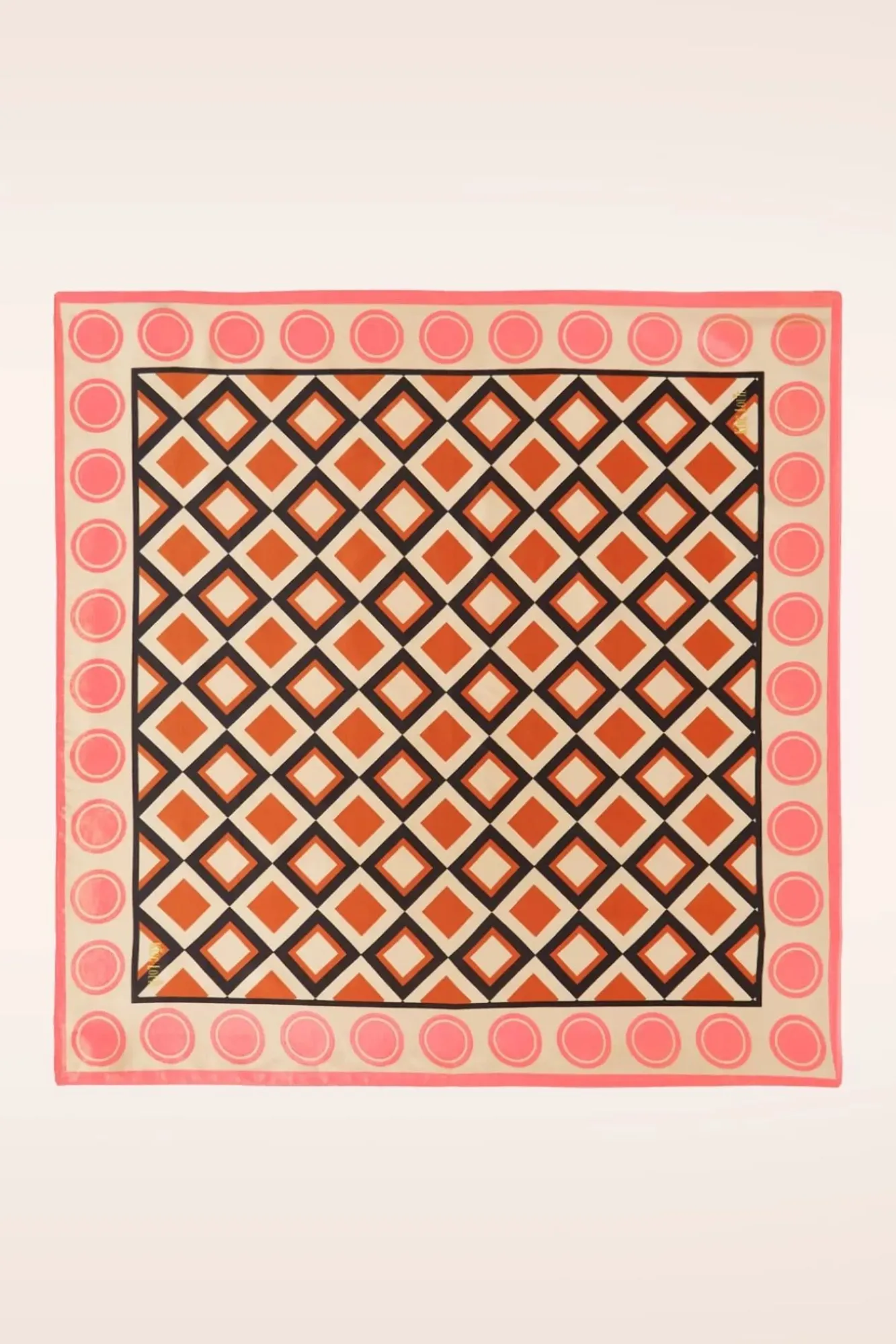 In Je Haar, Om Je Hals Of Aan Je Tas! Dit Karamelkleurige Sjaaltje Met Een Geometrische Retro Print Is Uitgevoerd In Een Glanzend Stofje Met De Look And Feel Van Luxe Satijn!