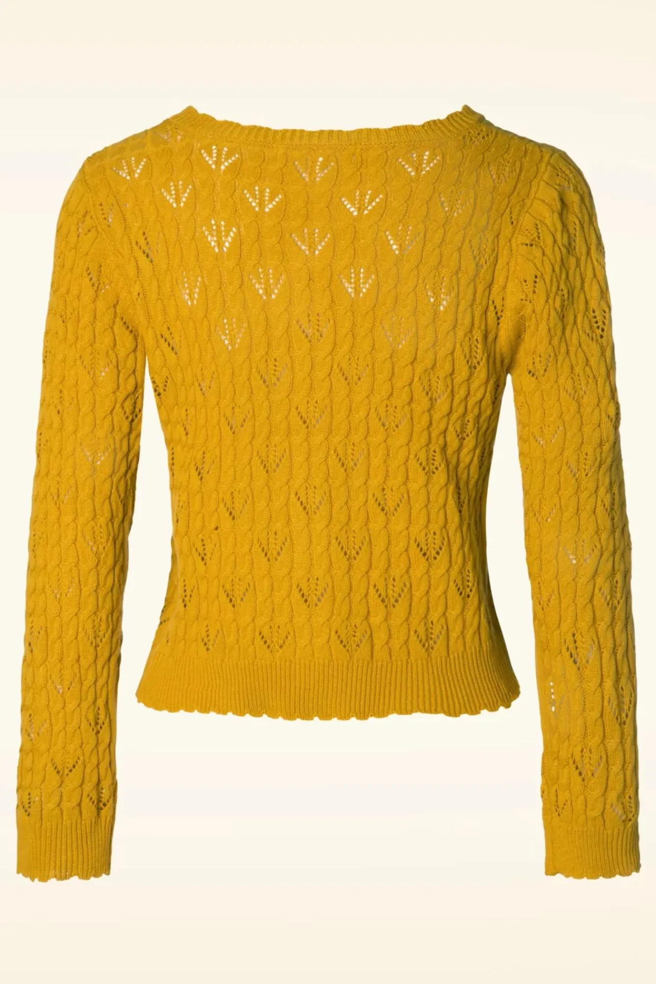 De 60S Claudia Cardigan In Honey Is Een Echte Klassieker… Online In Nederland, Duitsland En Frankrijk Exclusief Verkrijgbaar Bij Topvintage! Classy In Al Haar Eenvoud En Daardoor De Perfecte Match Met Al Jouw Vintage Kledingstukken! Deze Cardi Heeft Een Elegante V-Halslijn, Lange Mouwen, Geschulpte Biezen En Een Classy Opengewerkt Patroon. Uitgevoerd In Een Gebreide, Zachte, Honinggele Katoenmix Met Een Heerlijke Stretch Voor Een Mooie Aansluitende Pasvorm. De Combinatiemogelijkheden Zijn Eindeloos!