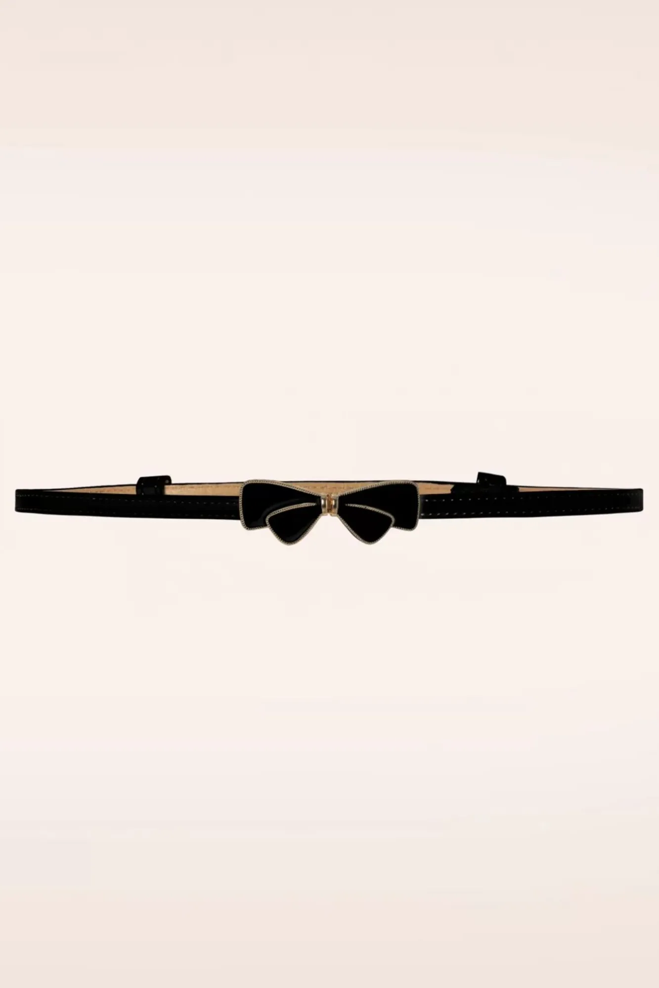 Deze 50S Lana Bow Riem In Zwart Is Een Classy Riempje In Vintage Look En Een Aanvulling Op Elke Outfit. Dit Smalle, Verstelbare Model Is Uitgevoerd In Zwart ‘Faux’ Lakleder En Sluit D.M.V. Een Elegant Goudkleurig Strikje, Très Chique! Een Echte Must-Have Voor Alle Vintage Loving Ladies!