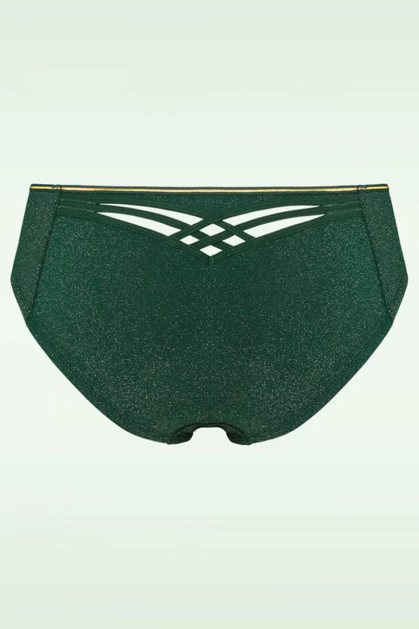 ‘Dare To Be Seen’ In Deze Dame De Paris High Brazilian Brief In Green And Gold! Ze Is Uitgevoerd In Een Stretchy Dennengroene Stof Met Een Subtiele Gouden Lurex Glitter En Een Prachtig Lijnenspel Op De Achterkant Van Het Broekje! Marlies Heeft Zich Bij Het Ontwerpen Van Deze Collectie Laten Inspireren Door De Glorieuze Notre Dame-Kathedraal En Tijdgenoot Hildegard Von Bingen.