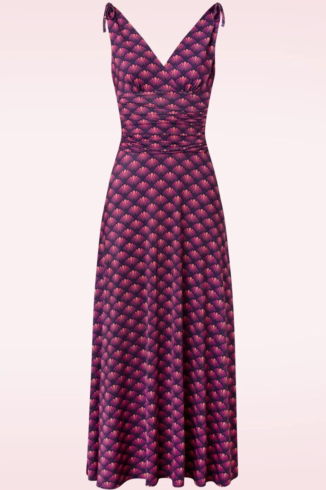 ‘Let’s Get Groovy’ In Deze 50S Grecian Fan Maxi Dress In Purple! De Top Heeft Zowel Aan De Voor- Als Achterkant Een Diepe V Met Mooie Overslag Waardoor Je Een Sexy Decolleté Laat Zien En Licht Geplooide Cups Die Doorlopen In Brede Schouderbandjes Met Een Speels Strikdetail Op De Schouder, Oh La La! Vanaf De Flatterende, Geplooide Tailleband Waaiert Ze Uit In Een Zwierige Maxi Rok. Uitgevoerd In Een Soepel, Stretchy Slinky Stofje Met Een Fantastische Retro Waaierprint In Paars- En Rozetinten Die Heerlijk Draagt. ”Go Get Your Groove On!”