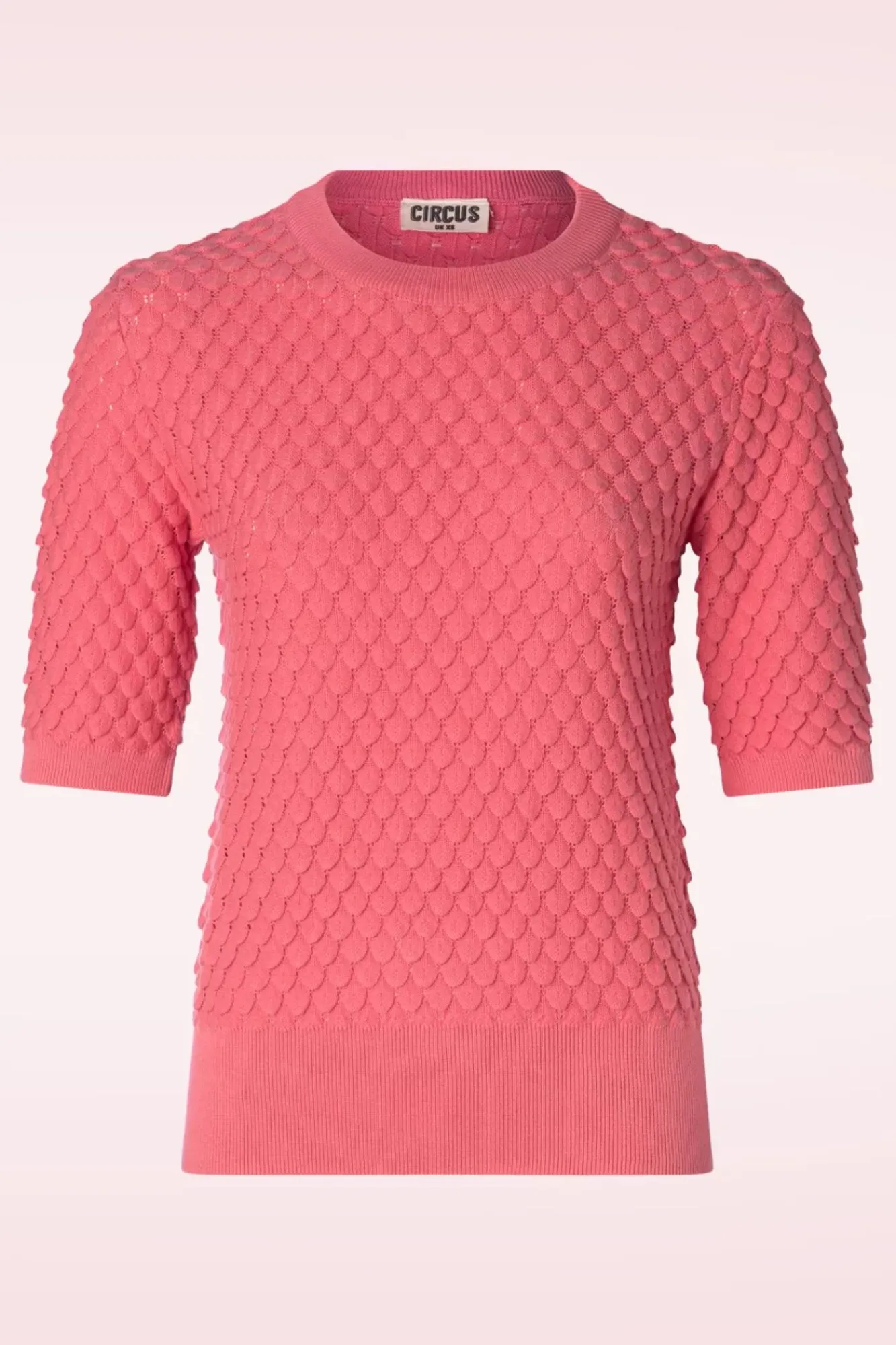 ”Hello Pretty!” Deze Schattige Top Is Uitgevoerd In Een Fijngebreide, Soepele En Stretchy, Organische Katoen In Koraalroze, Voorzien Van Een Geschulpt Patroon.